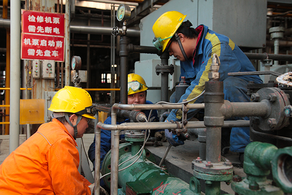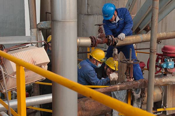 11月29日是星期日,大檢修現(xiàn)場依舊繁忙。合成C1、C2、C3塔正在穿上新衣,新的保溫材料一節(jié)節(jié)往上包裝,副總經(jīng)理趙強在現(xiàn)場檢查并問詢情況;氣化爐的換磚備爐工作在爐內(nèi)、爐外同時開展,撈渣機的鎖渣閥正在復位,電氣人員機泵接線認真仔細;合成現(xiàn)場的操作人員在配合調(diào)整管線的氮氣壓力;尿素框架下,甲氨泵的檢修正在進行,框架上的閥門更換大家齊心協(xié)力;新尿素汽提塔安裝現(xiàn)場,交叉作業(yè)緊張有序,監(jiān)護人員時刻緊盯著塔內(nèi)的施工安全;機組檢修正在掀起回裝的高潮……